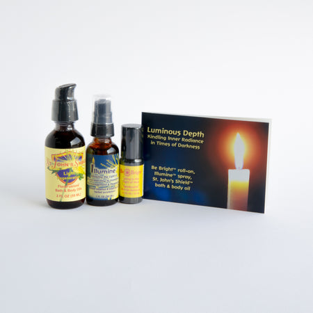 Three key formulas to assist the soul during times of discouragement and depression. Be Bright Roll On is meant to immediately dispel feelings of heaviness and lethargy while resolving discordant elements affecting positivity. Illumine Flourish Formula works with balancing the twin polarities of light/dark, levity/gravity, so that the body soul matrix can establish its own internal strength and equilibrium. St John’s Shield Bath and Body Oil contains the key ingredient of St. John’s Shield flower, both in flower essence and as a solarized oil to help catalyze and absorb light and warmth during times of depletion and darkness. Thus, a great set to give to a loved one who is experiencing discouragement or depression, and also for those who experience seasonal affective disorder during the cold and dark of winter.