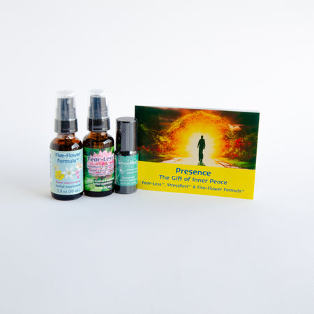 A synergistic set of three products to instill calm and equanimity in times of stress and disruption. Includes Fear-Less Flourish Formula to help with anxiety by bringing calming and centering forces to alleviate unnecessary apprehension and anxiety. StressRest Roll On essential oil and flower essence formula to be placed on pulse points for immediate relief in times of stress. Five-Flower Formula to be used in distressing situations to help one regain control and bring one “back to center”. A great gift set to give to the anxious and stressed to help them regain inner peace and composure.